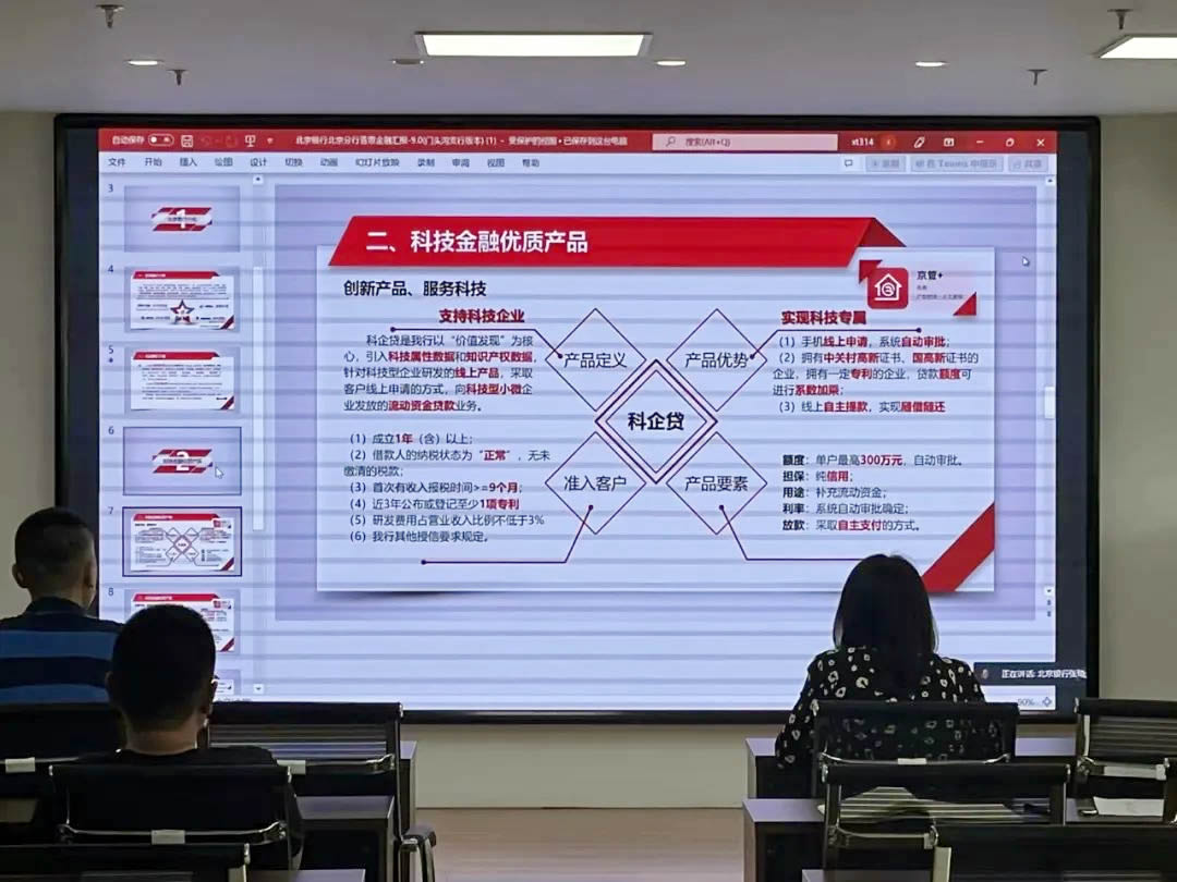 會上北京銀行北京分行普惠金融部張琦老師介紹了關于支持科技企業(yè)的“科企貸”、“銀稅貸”、“創(chuàng)業(yè)擔保貸”、“融信寶”等融資政策,最高授信1億元,為企業(yè)的發(fā)展保駕護航。